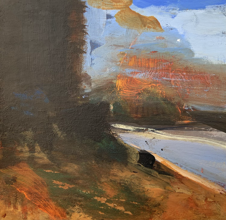 She absorbs the feelings evoked by the colour, light and shape and tries to express them on paper, canvas or wooden panel. Her paintings are intuitive and in large gestures and blocks of colour and are vibrant, bold and exciting.